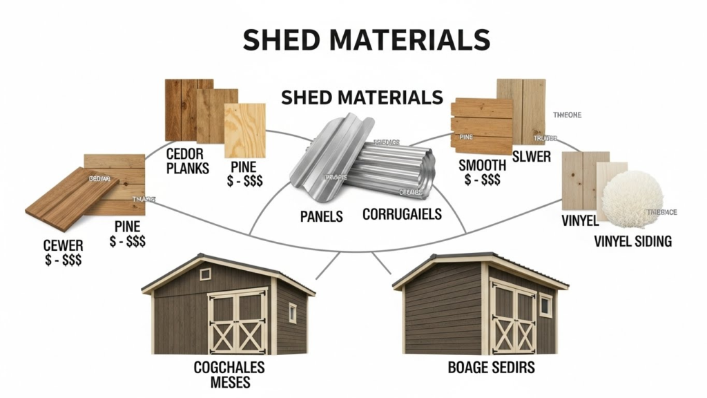 The material you choose affects not only the price but also the shed’s durability, maintenance needs, and appearance.