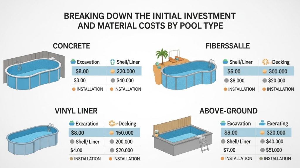 The biggest factor in your budget is the material you choose for the pool shell. There are three main contenders: vinyl liner, fiberglass, and concrete (gunite).